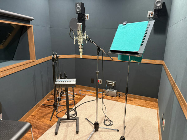 レコーディング前にスタジオ内の清掃を欠かさず行った後、使用するマイクをブース内にセッティングしマイクポケットに繋げます。アーティストさんがご到着されて、マイキング・高さを調整後すぐに録り始められるように、事前に譜面台などの準備もしておきます。