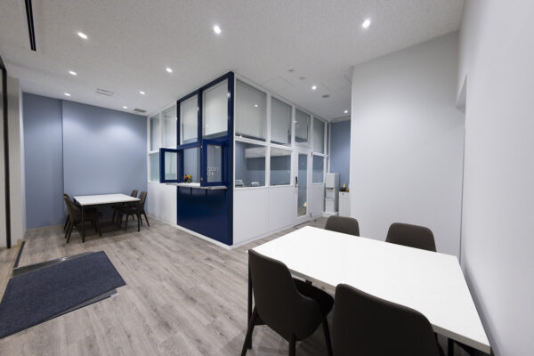 まずは入口を入ってすぐ、受付前に設置されている共用スペースをご紹介いたします。こちらはご予約不要で、どなたでもご利用いただけます。4名掛けのテーブルとイスは、デザイン性はもちろんのこと、使い勝手の良さにもこだわって選定しました。