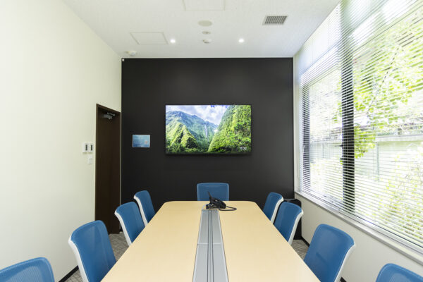 この会議室には大型モニターが常設されており、HDMIケーブルでお客様のPC(HDMIポートが必要になります)と接続すれば、資料投影用のディスプレイとしてもご利用可能です。また、リモート接続した映像を映し出すことで、各スタジオの収録の様子を、遠隔で確認することが可能です。