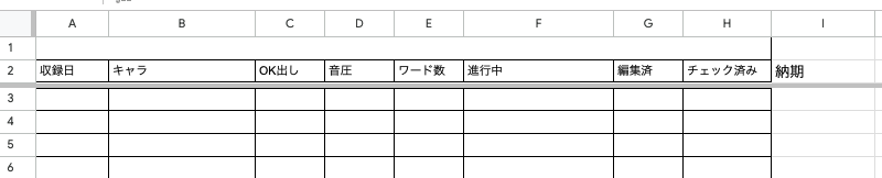 作業の進行状況や納期、スタジオブッキング状況をチーム全体で把握するため、Googleスプレッドシートを活用した進行管理表を運用しています。案件単位で収録日、編集工程、納期などを可視化し、誰がどの工程を担当しているかをリアルタイムで共有することで、属人化を防ぎ、安定したプロジェクト運営を実現しています。