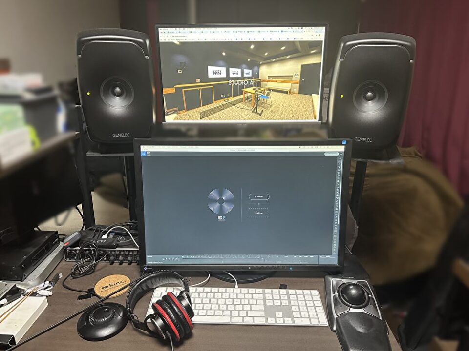 私の場合、持ち合わせのものと組み合わせて作業しやすい環境にしています。デュアルディスプレイにすることで、編集画面とスケジュールや連絡の画面に分けることができ、常に進行状況が見えるようになっています。基本的にはヘッドホンで作業を行いますが、セリフのチェックやセッションの確認、聴き疲れした時はスピーカーに切り替えて使い分けをしています。